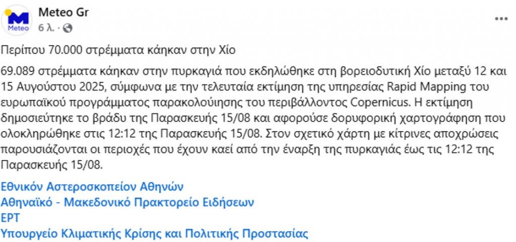 Το Εθνικό Αστεροσκοπείο ενημέρωσε πως στη βορειοδυτική Χίο, μεταξύ 12 και 15 Αυγούστου κάηκαν 69.089 στρέμματα, σύμφωνα με την τελευταία εκτίμηση της υπηρεσίας Rapid Mapping του ευρωπαϊκού προγράμματος παρακολούθησης του περιβάλλοντος Copernicus.