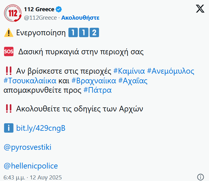 Οι εκκενώσεις συνεχίζονται με το 112 να στέλνει μήνυμα και ζητά από τους πολίτες στην περιοχές Καμίνια, Ανεμόμυλος, Τσουκαλαίικα και Βραχναίικα να απομακρυνθούν προς την Πάτρα.