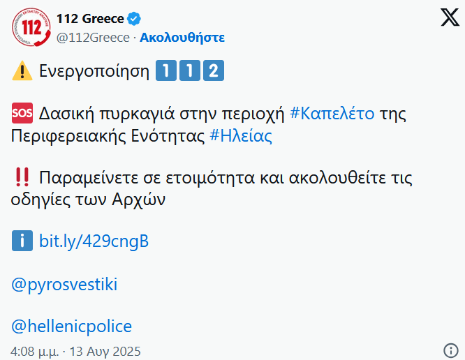 Πυρκαγιά ξέσπασε στην περιοχή Καπελέτο στην Ηλεία σε δασική έκταση με το 112 να ηχεί και να καλεί τους πολίτες σε ετοιμότητα.