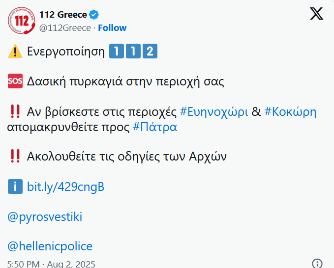 Λίγο πριν από τις 18:00 στάλθηκε μήνυμα από το 112 για την απομάκρυνση των κατοίκων στις περιοχές Ευηνοχώρι και Κοκώρη προς την Πάτρα.