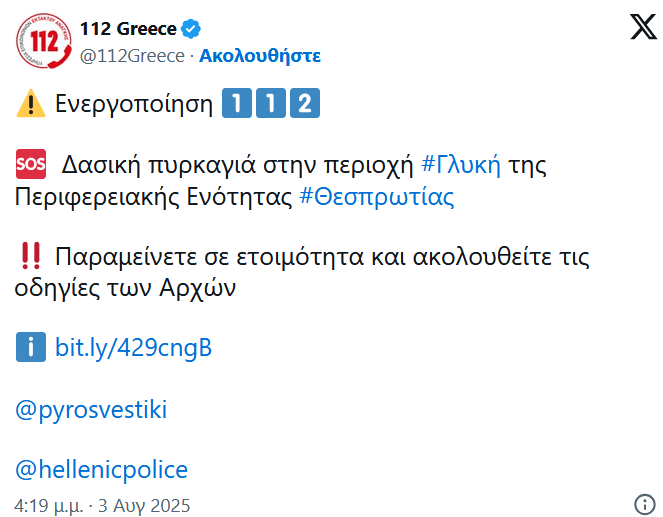 Στις 16.30 εστάλη μήνυμα του 112 στους κατοίκους που βρίσκονται κοντά στην Γλυκή Θεσπρωτίας, να είναι σε ετοιμότητα λόγω της μεγάλης φωτιάς.