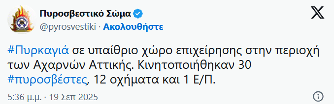 Πυρκαγιά ξέσπασε το απόγευμα της Παρασκευής 19.09.2025 στις Αχαρνές σε εργοστάσιο ξυλείας. Η πυρκαγιά ξέσπασε στις 6:42 σε προαύλιο χώρο εργοστασίου και σύμφωνα με πληροφορίες του newsit.gr, καίγονται παλέτες.