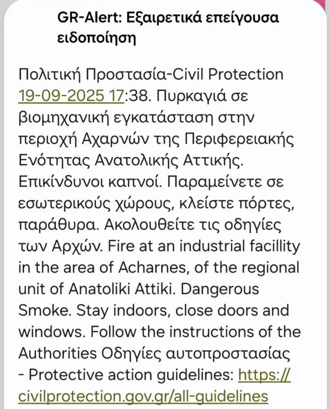 Λίγο μετά την εκδήλωση της πυρκαγιάς, εστάλη μήνυμα 112 στους κατοίκους κοντινών περιοχών να παραμείνουν σε εσωτερικούς κλειστούς χώρους, με κλειστές πόρτες και παράθυρα λόγω των επικίνδυνων καπνών.
