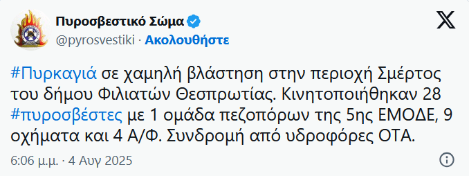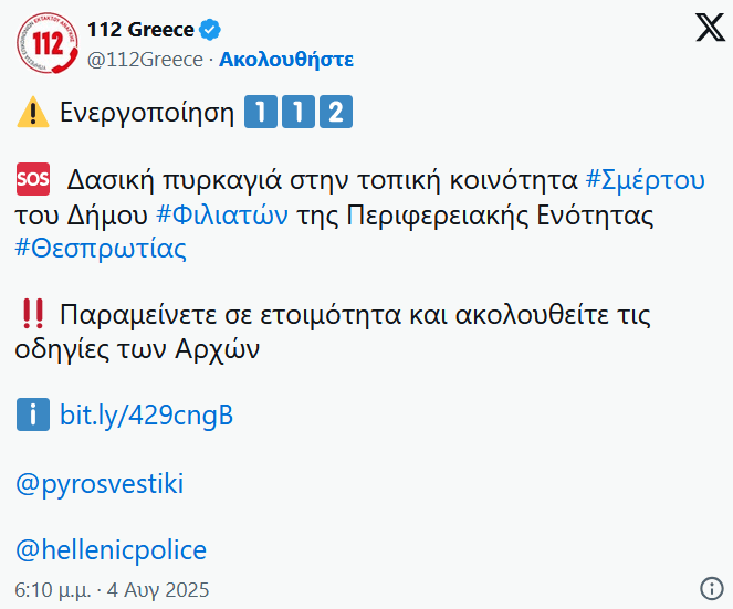 «Δασική πυρκαγιά στην τοπική κοινότητα Σμέρτου του Δήμου Φιλιατών της Περιφερειακής Ενότητας Θεσπρωτίας. Παραμείνετε σε ετοιμότητα και ακολουθείτε τις οδηγίες των Αρχών», αναφερόταν συγκεκριμένα στο μήνυμα.