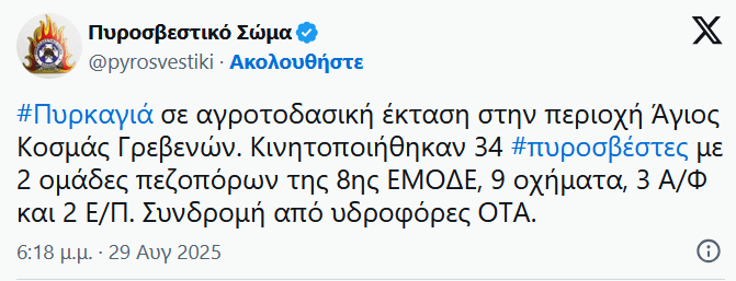Πυρκαγιά σε αγροτοδασική έκταση ξέσπασε το απόγευμα της Παρασκευής (29/8) στην περιοχή Άγιος Κοσμάς Γρεβενών.