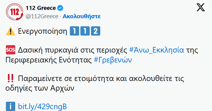 Μάλιστα, λίγο μετά τις 18.30 εστάλη μήνυμα από το 112 σε όσους βρίσκονται στην περιοχή Άνω Εκκλησία της Περιφερειακής Ενότητας Γρεβενών να είναι σε ετοιμότητα.