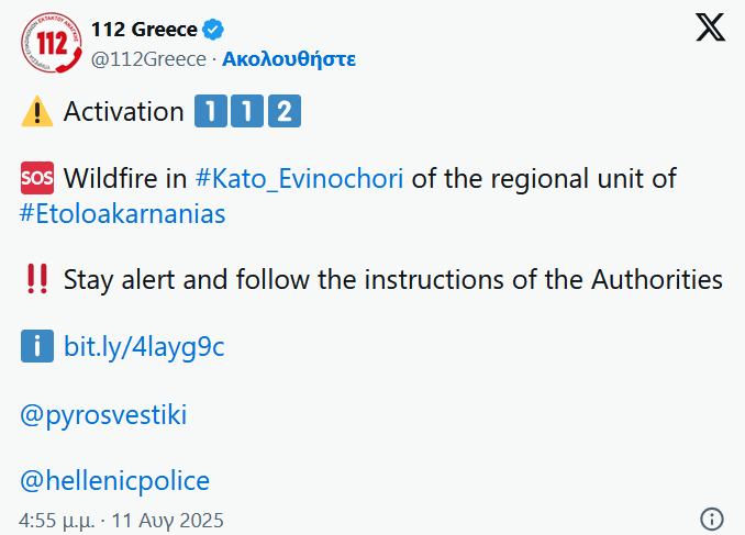 Από αέρος, στο έργο της κατάσβεσης συμμετέχουν 3 πυροσβεστικά αεροσκάφη. Λίγο πριν τις 17.00 το απόγευμα, χτύπησε μήνυμα του 122 στους κατοίκους του Κάτω Ευηνοχωρίου, να είναι σε ετοιμότητα.