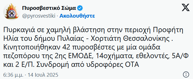 Πυρκαγιά εκδηλώθηκε σε χαμηλή βλάστηση στην περιοχή Προφήτη Ηλία του δήμου Πυλαίας - Χορτιάτη Θεσσαλονίκης, το απόγευμα της Δευτέρας.