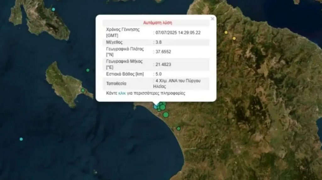 Σεισμός σημειώθηκε το απόγευμα της Δευτέρας (07.07.2025) στον Πύργο Ηλείας.
