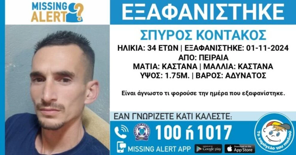 Σε κατάσταση συναγερμού για την εξαφάνιση 34χρονου από τον Πειραιά βρίσκονται οι Αρχές. Τα ίχνη του Σπύρου Κ. σύμφωνα με τη σχετική ανακοίνωση χάθηκαν στις 1/11/2024.