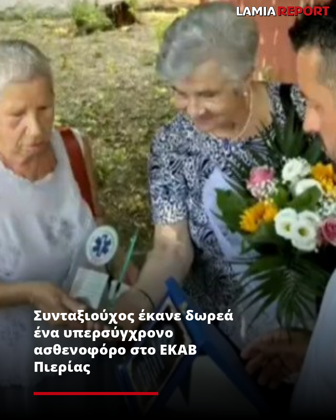 Πρόκειται για την κα Πετρούλα Μαλαμίδου, η οποία προχώρησε στη δωρεά ενός ολοκαίνουριου ασθενοφόρου για τις ανάγκες του ΕΚΑΒ Πιερίας, στη μνήμη αγαπημένων της προσώπων που έφυγαν από τη ζωή.