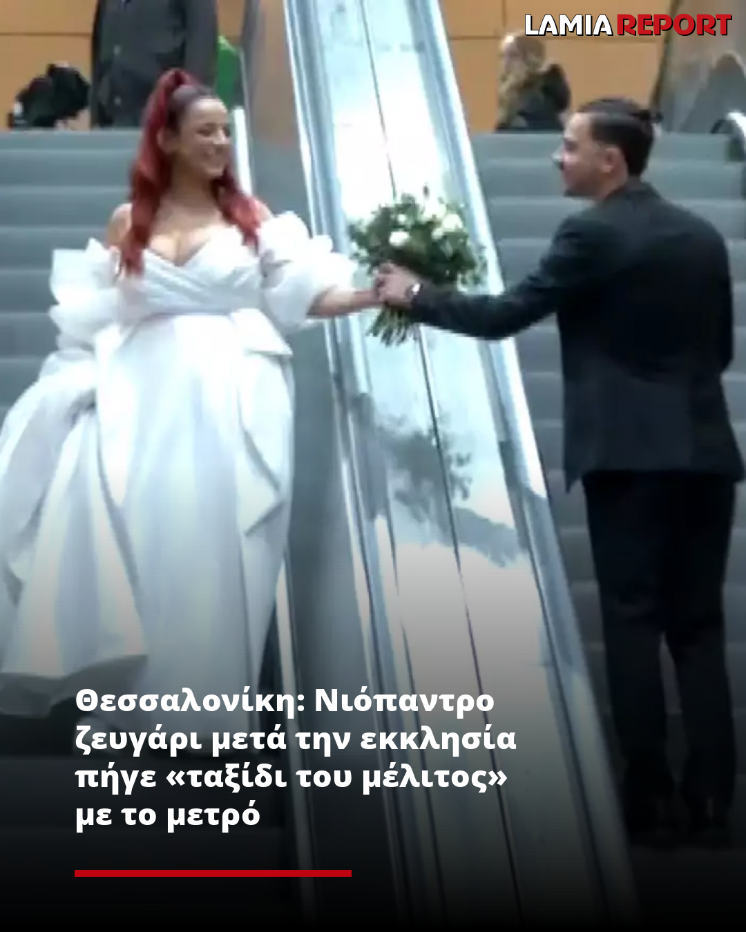 Η εικόνα του νιόπαντρου ζευγαριού με το νυφικό και το γαμπριάτικο κοστούμι μέσα το μετρό της Θεσσαλονίκης, προφανώς δεν πέρασε απαρατήρητη.
