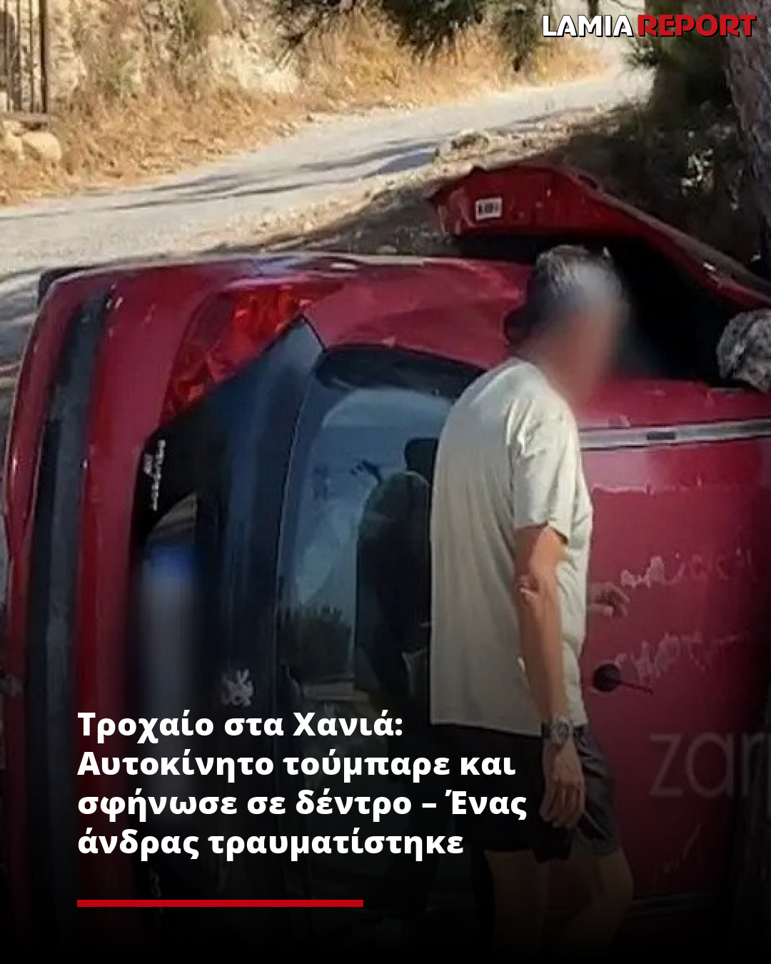 Ο οδηγός του οχήματος, κατάφερε και με τη βοήθεια περαστικών να βγει από το αυτοκίνητο που είχε τουμπάρει και σφηνώσει στο δέντρο την ώρα του τροχαίου, ενώ η Πυροσβεστική των Χανίων έφτασε στο σημείο προληπτικά, αλλά και για να αφαιρέσει τους πόλους της μπαταρίας του αυτοκινήτου για να μην προκληθεί πυρκαγιά.