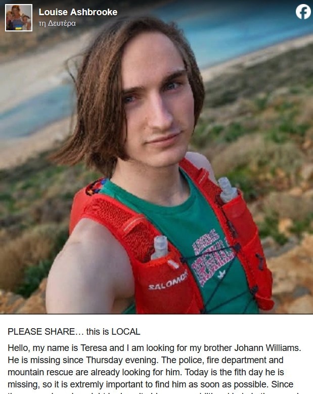 Η ίδια τόνισε πως κάθε στιγμή είναι κρίσιμη, αφού ο αδελφός της αγνοείται για πέμπτη ημέρα, και ζήτησε την υποστήριξη όσων μπορούν να βοηθήσουν.