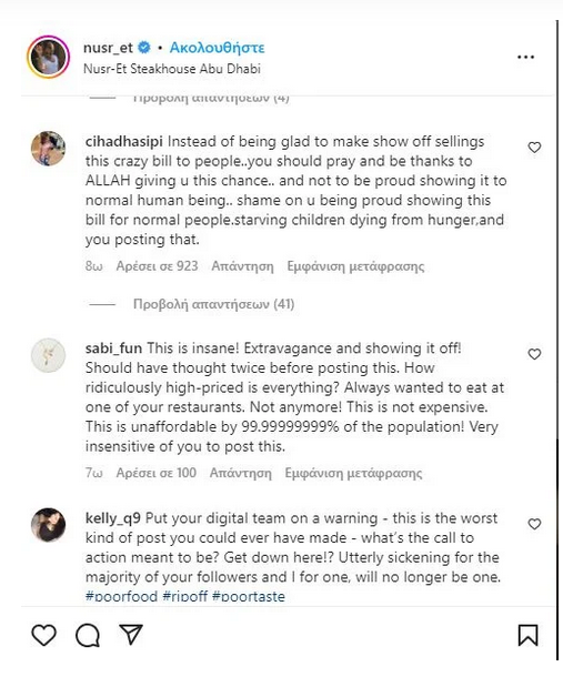 Μερικά από τα σχόλια αναφέρουν: «26.000 δολάρια για ορεκτικά; θεραπεύουν μήπως τον καρκίνο;», «Ξεκάθαρη ληστεία», “Είναι φοβερό, αυτό το ποσό θα βοηθούσε ένα ολόκληρο χωριό να μην πεθάνει”, “Θα έπρεπε να το σκεφτείς δύο φορές πριν το ανεβάσεις αυτό. Πόσο γελοία υπερεκτιμημένα είναι τα πάντα;”.