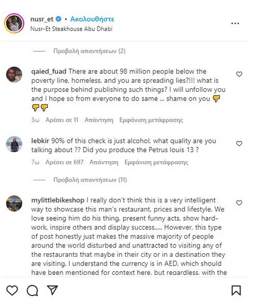 «Φωτιές» άναψε η τελευταία ανάρτηση του Τούρκου σεφ Νουσρέτ, ο οποίος δημοσίευσε μία απόδειξη από το εστιατόριό του στο Άμπου Ντάμπι που άγγιξε το ιλιγγιώδες ποσό των 161.782 ευρώ.