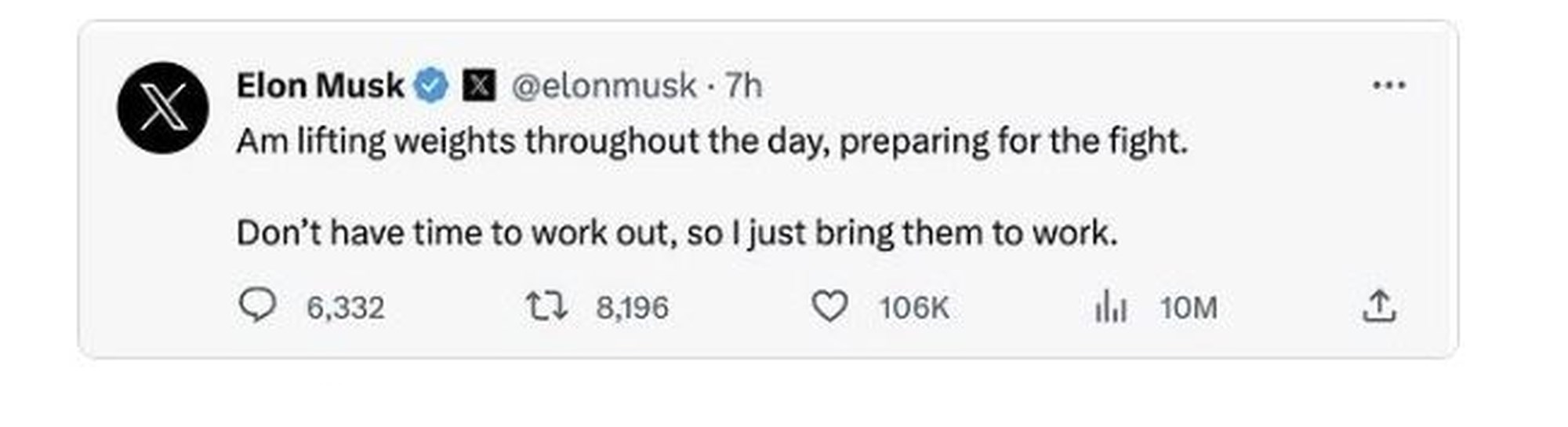 Ωστόσο, ο 52χρονος την Κυριακή ανέφερε σε tweet ότι προπονείται για προετοιμασία. "Σηκώνω βάρη όλη την ημέρα, προετοιμάζομαι για τον αγώνα. Δεν έχω χρόνο για γυμναστική, οπότε τα φέρνω στη δουλειά".