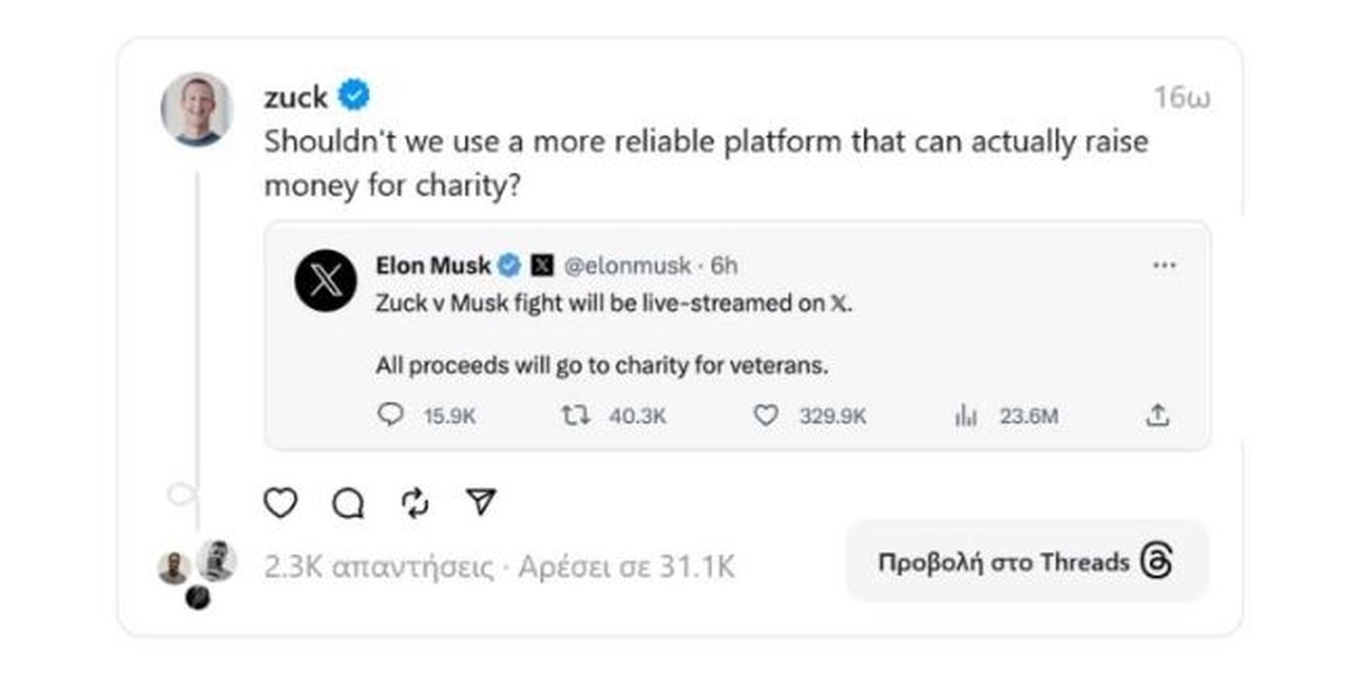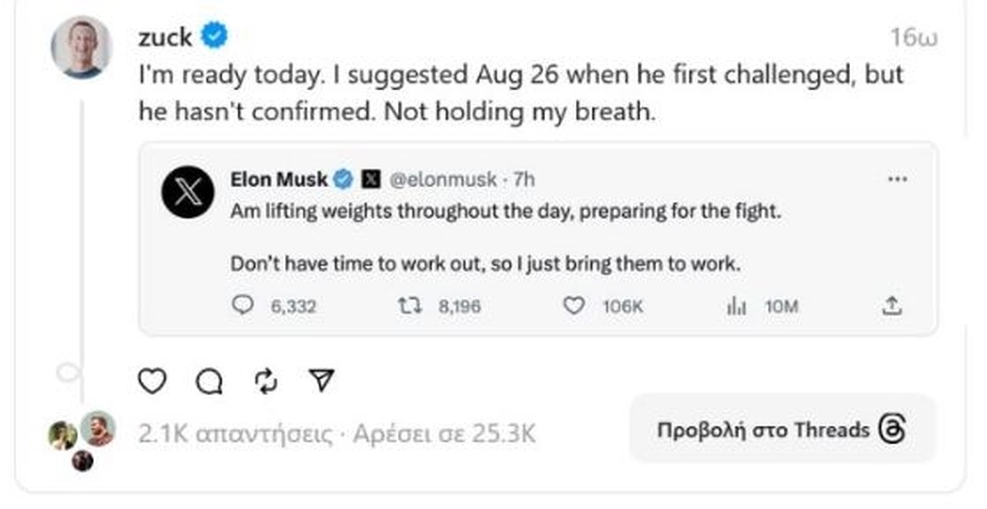 O Ζούκερμπεργκ απάντησε στην πλατφόρμα του Threads, την οποία λάνσαρε πρόσφατα ως αντίπαλο δέος του Twitter του Μασκ: "Είμαι έτοιμος σήμερα. Πρότεινα τις 26 Αυγούστου όταν με προκάλεσε για πρώτη φορά, αλλά δεν το επιβεβαίωσε. Δεν κρατάω την αναπνοή μου. Λατρεύω αυτό το άθλημα και θα συνεχίσω να αγωνίζομαι με ανθρώπους που προπονούνται ό,τι κι αν συμβεί εδώ".