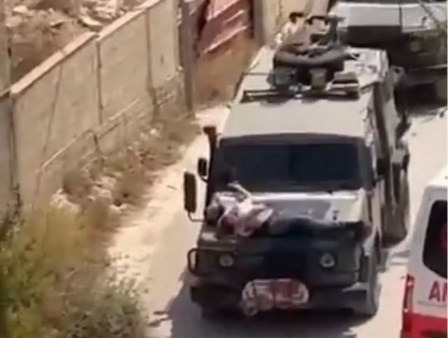 Ένα βίντεο που κυκλοφόρησε σε μέσα κοινωνικής δικτύωσης και επαληθεύεται από το Reuters δείχνει έναν Παλαιστίνιο κάτοικο της Τζενίν, τον Μουτζάχεντ Αζμί, δεμένο πάνω στο καπό του τζιπ, καθώς το τελευταίο περνάει δίπλα από δύο ασθενοφόρα.