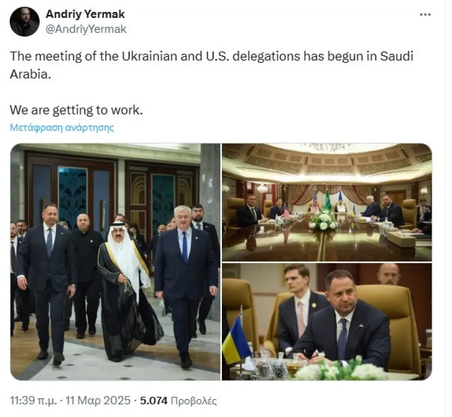 Στη Σαουδική Αραβία διεξάγονται αυτή την ώρα οι κρίσιμες συζητήσεις ανάμεσα στις αντιπροσωπείες των ΗΠΑ και της Ουκρανίας, ώστε να βρεθεί η χρυσή τομή που θα δώσει το έναυσμα για την παύση των εχθροπραξιών στον πόλεμο που έχει εξαπολύσει εναντίον της Ουκρανίας η Ρωσία.