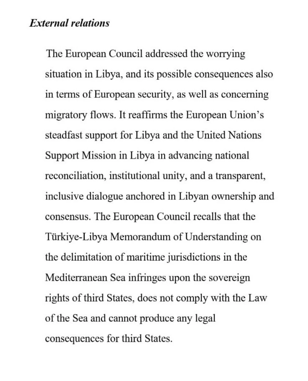 «Το Ευρωπαϊκό Συμβούλιο, σύμφωνα με το newsbeast.gr, υπενθυμίζει ότι το Μνημόνιο Συνεννόησης Τουρκίας-Λιβύης για την οριοθέτηση περιοχών θαλάσσιας Δικαιοδοσίας στη Μεσόγειο παραβιάζει τα κυριαρχικά δικαιώματα τρίτων κρατών, δεν συνάδει με το Δίκαιο της Θάλασσας και δεν μπορεί να παράγει έννομες συνέπειες για τρίτα κράτη».