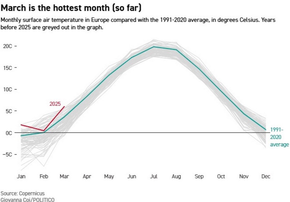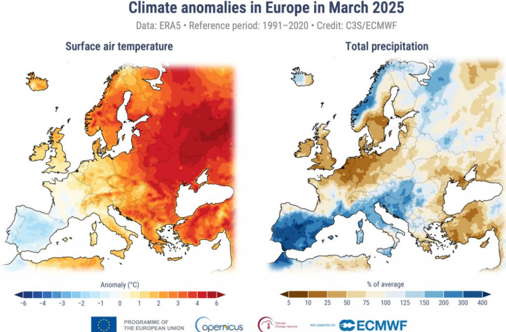 «Ο Μάρτιος του 2025 ήταν ο θερμότερος Μάρτιος που έχει καταγραφεί ποτέ για την Ευρώπη, γεγονός που υπογραμμίζει για ακόμη μία φορά τη συνεχή άνοδο των θερμοκρασιών», δήλωσε η Σαμάνθα Μπέργκες, αναπληρώτρια διευθύντρια της Υπηρεσίας Κλιματικής Αλλαγής του Copernicus.