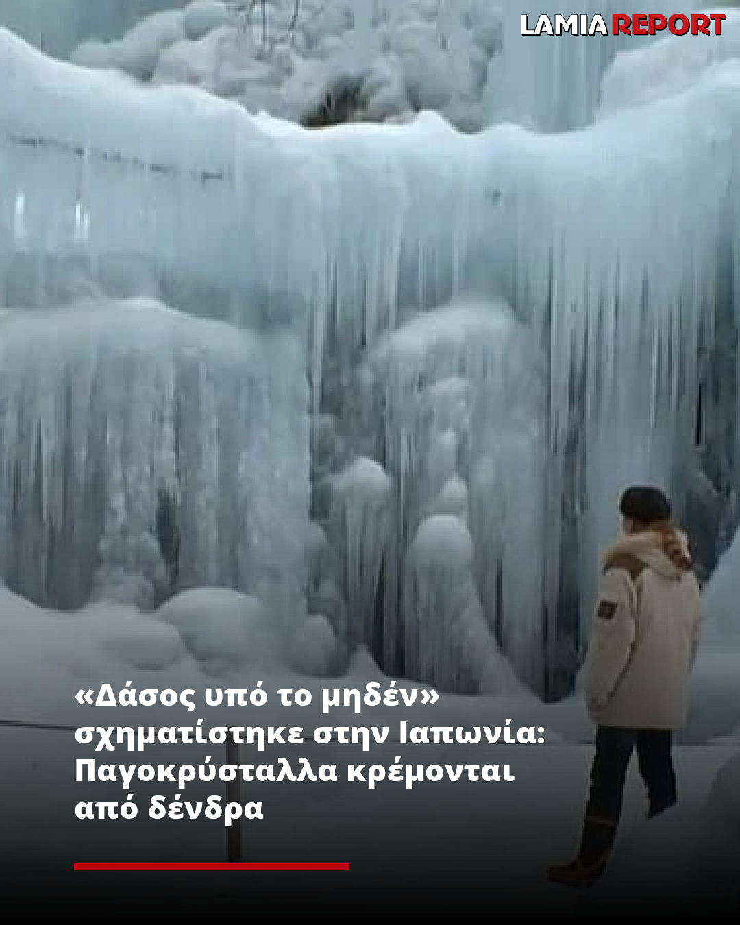Το δάσος έχει μια φανταστική όψη, με παγοκρύσταλλα να κρέμονται από τα δένδρα σαν κουρτίνες και άλλα που μοιάζουν με μέδουσες, περιγράφει το πρακτορείο ειδήσεων της Ιαπωνίας.