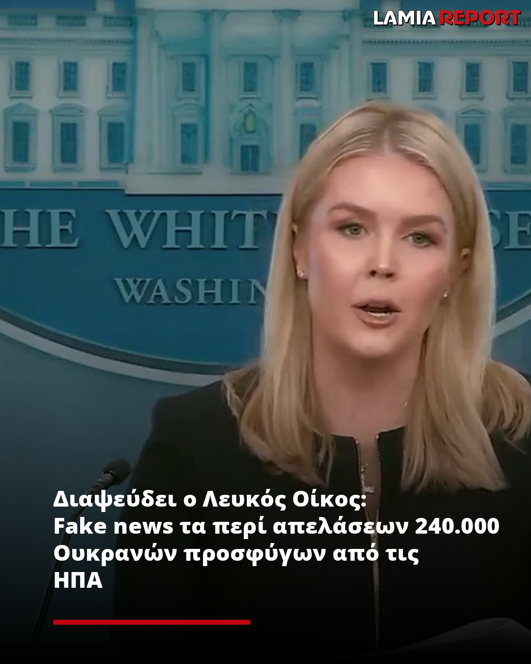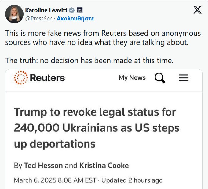 Η εκπρόσωπος του Λευκού Οίκου Καρολάιν Λέβιτ διέψευσε κατηγορηματικά την πληροφορία που μετέδωσε το πρακτορείο Reuters σύμφωνα με την οποία, ο Ντόναλντ Τραμπ σχεδιάζει να ανακαλέσει το προσωρινό νομικό καθεστώς περίπου 240.000 Ουκρανών που κατέφυγαν στις Ηνωμένες Πολιτείες λόγω του πολέμου.