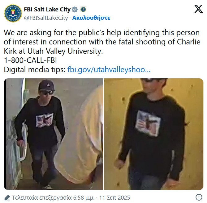Σε ανάρτησή του στο Χ, το ομοσπονδιακό γραφείο του Σολτ Λέικ Σίτι ανέφερε συγκεκριμένα: «Ζητάμε τη βοήθεια του κοινού για την ταυτοποίηση αυτού του ατόμου σε σχέση με τον θανάσιμο πυροβολισμό του Τσάρλι Κερκ».