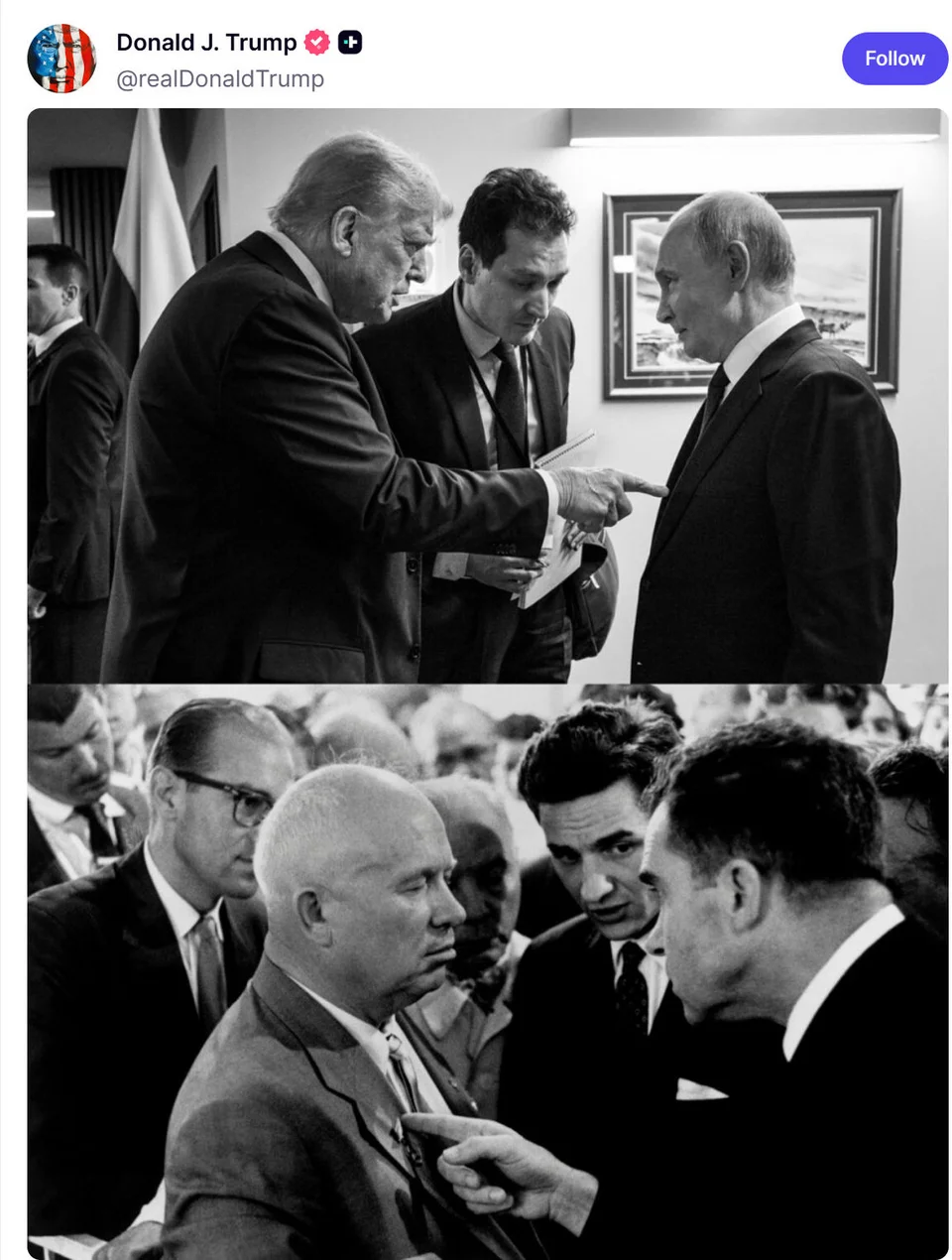 Ο Τραμπ ανάρτησε, μάλιστα, φωτογραφία του με τον Ρώσο Πρόεδρο Πούτιν, σε μια ενέργεια που πολλοί ερμηνεύουν ως συμβολική και με αναφορές στην ιστορική σύγκρουση της Σοβιετικής Ένωσης με τις ΗΠΑ, η οποία υπογραμμίζει την εικόνα του ως ηγέτη που προσπαθεί να διαπραγματευτεί σκληρά με τη Ρωσία.