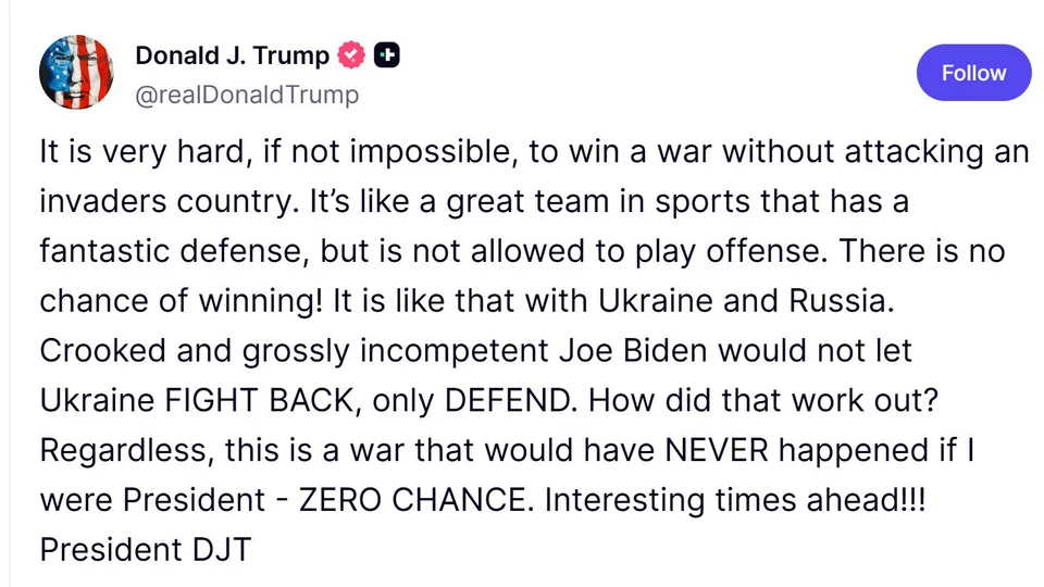 Σε ανάρτησή του στο Truth Social την Πέμπτη (21/8), ο πρόεδρος των ΗΠΑ, προχώρησε σε μια ιδιαίτερα προκλητική τοποθέτηση σχετικά με τον πόλεμο στην Ουκρανία, υποστηρίζοντας ότι η χώρα πρέπει να περάσει σε επιθετικές επιχειρήσεις κατά της Ρωσίας.