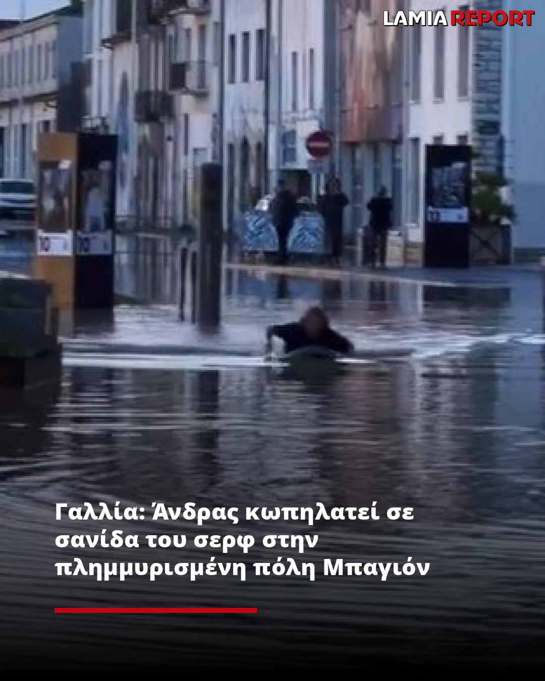 Αυτόπτης μάρτυρας κατέγραψε έναν άνδρα να κωπηλατεί μέσα στην πλημμυρισμένη Μπαγιόν την Παρασκευή, στον απόηχο των έντονων βροχοπτώσεων που έπληξαν τη νότια Γαλλία.
