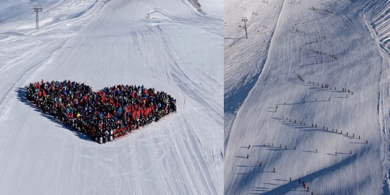 Εκατοντάδες σκιέρ συγκεντρώθηκαν στην κεντρική πίστα του θέρετρου και κατέβηκαν συντονισμένα από την κορυφή έως τη βάση, σχηματίζοντας στο χιόνι μια τεράστια καρδιά, ένα ζωντανό σύμβολο μνήμης, σεβασμού και ενότητας.