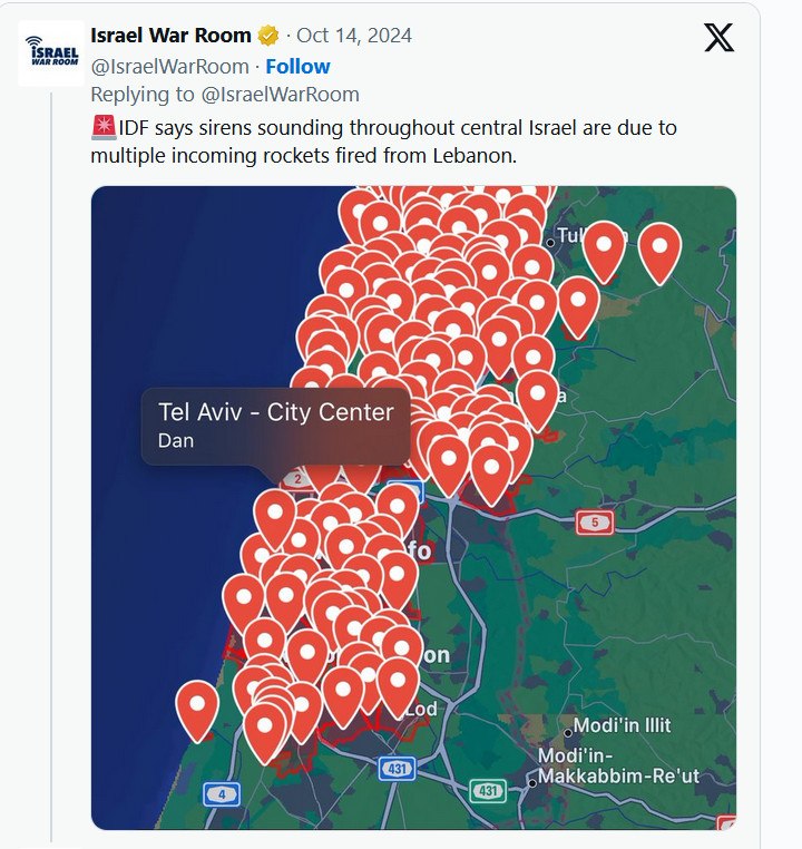 Σύμφωνα με τον ισραηλινό στρατό, τα τελευταία λεπτά σειρήνες ηχούν λόγω ρουκετών, απειλώντας περιοχές του κεντρικού Ισραήλ όπως και το Τελ Αβίβ, γεγονός που έχει οδηγήσει εκατομμύρια Ισραηλινούς σε καταφύγια.