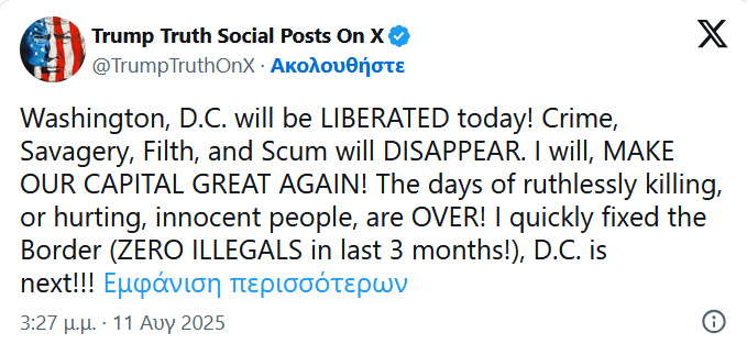 Σε ανάρτησή του στο Truth Social, ανέφερε: «Η Ουάσιγκτον θα ΑΠΕΛΕΥΘΕΡΩΘΕΙ σήμερα! Το έγκλημα, η βαρβαρότητα, η βρωμιά και τα αποβράσματα θα ΕΞΑΦΑΝΙΣΤΟΥΝ. Θα ΚΑΝΩ ΤΗΝ ΠΡΩΤΕΥΟΥΣΑ ΜΑΣ ΠΟΛΗ ΜΕΓΑΛΗ ΞΑΝΑ! Οι μέρες των αδίστακτων δολοφονιών και των τραυματισμών αθώων ανθρώπων έχουν ΤΕΛΕΙΩΣΕΙ! Έφτιαξα γρήγορα τα σύνορα (ΜΗΔΕΝ ΠΑΡΑΝΟΜΟΙ τους τελευταίους 3 μήνες!), η Ουάσιγκτον είναι η επόμενη!!!», θεωρώντας ότι η κατάσταση είναι «εντελώς εκτός ελέγχου».