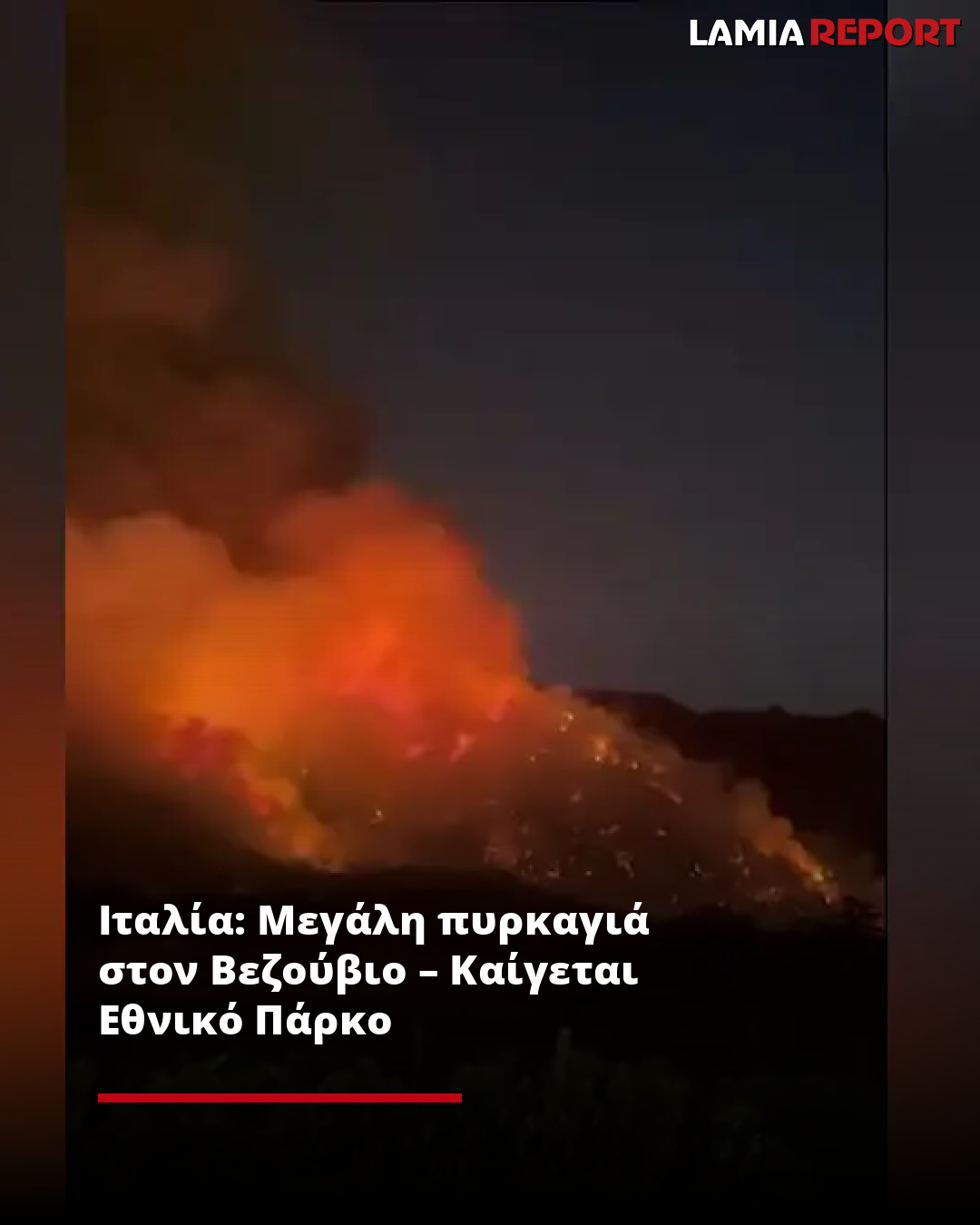 Πλάνα της RAI, τραβηγμένα από τον Santolo Eliano, δείχνουν τη φωτιά να μαίνεται ανεξέλεγκτη στην πλαγιά του βουνού.