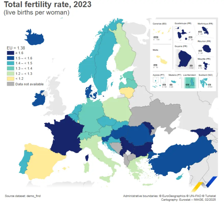 Ο συνολικός δείκτης γονιμότητας στην ΕΕ μειώθηκε σύμφωνα με τη Eurostat σε 1,38 γεννήσεις ανά γυναίκα, το χαμηλότερο επίπεδο από το 2004, ενισχύοντας τους φόβους για ένα μέλλον με γηράσκοντα πληθυσμό και σοβαρές κοινωνικοοικονομικές επιπτώσεις.