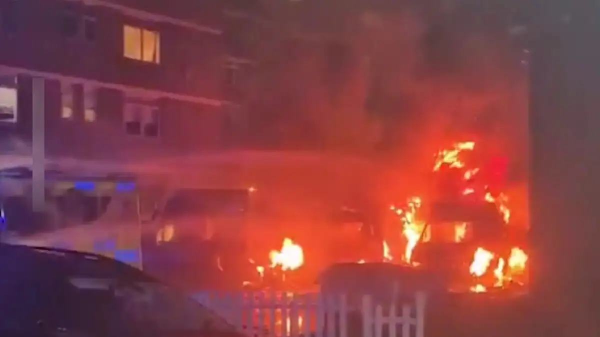 Βίντεο από το σημείο δείχνουν τρία άτομα με κουκούλες να ρίχνουν βενζίνη στα οχήματα και να τα πυρπολούν.
