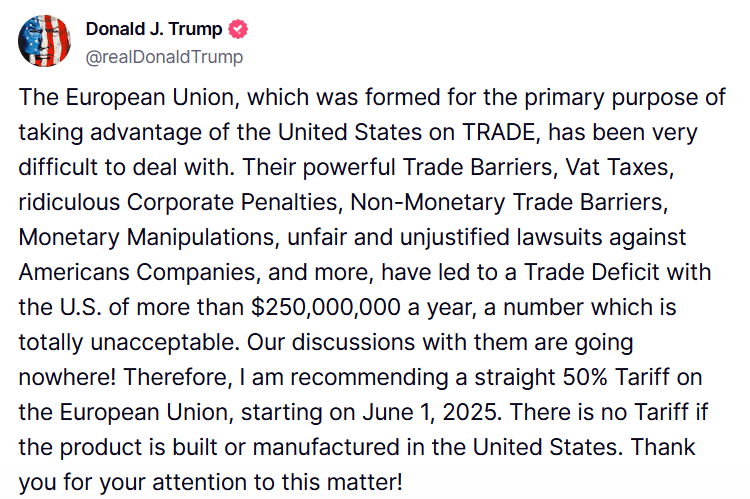 «Η Ευρωπαϊκή Ένωση, η οποία σχηματίστηκε με πρωταρχικό σκοπό την εκμετάλλευση των Ηνωμένων Πολιτειών στο ΕΜΠΟΡΙΚΟ ΣΧΕΔΙΟ, ήταν πολύ δύσκολη στην αντιμετώπιση. Τα ισχυρά εμπορικά εμπόδια, οι φόροι ΦΠΑ, οι γελοίες εταιρικές κυρώσεις, τα μη νομισματικά εμπορικά εμπόδια, οι νομισματικοί χειρισμοί, οι άδικες και αδικαιολόγητες αγωγές κατά αμερικανικών εταιρειών και άλλα, έχουν οδηγήσει σε εμπορικό έλλειμμα με τις ΗΠΑ άνω των 250.000.000 δολαρίων ετησίως, ένα ποσό που είναι εντελώς απαράδεκτο. Οι συζητήσεις μας μαζί τους δεν οδηγούν πουθενά! Ως εκ τούτου, προτείνω έναν άμεσο δασμό 50% στην Ευρωπαϊκή Ένωση, από την 1η Ιουνίου 2025. Δεν υπάρχει δασμός εάν το προϊόν κατασκευάζεται στις Ηνωμένες Πολιτείες. Σας ευχαριστώ για την προσοχή σας σε αυτό το θέμα!».