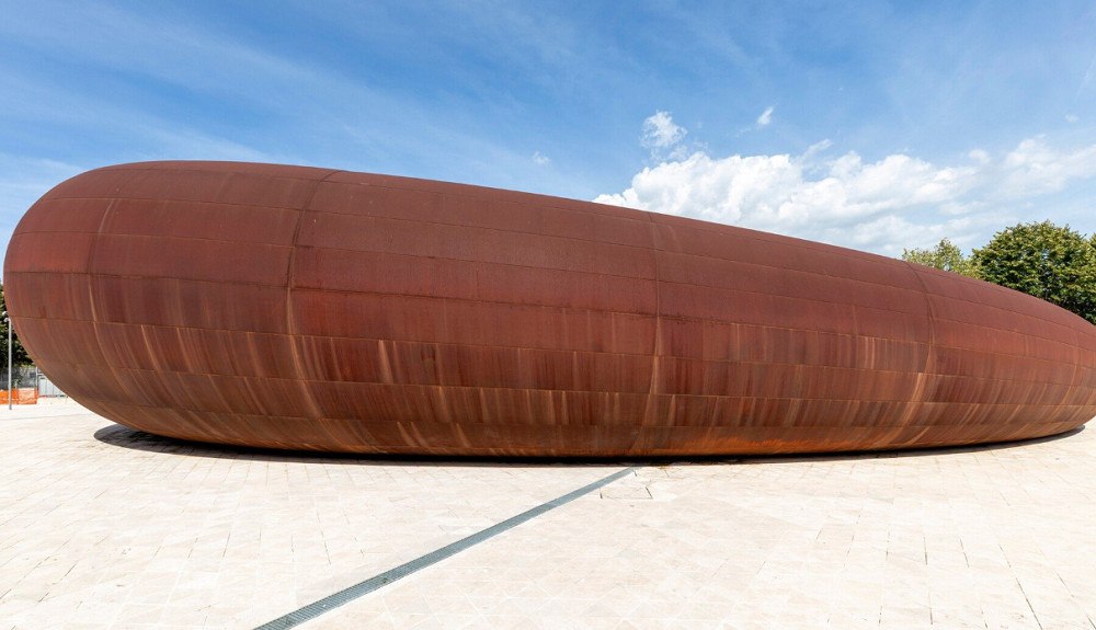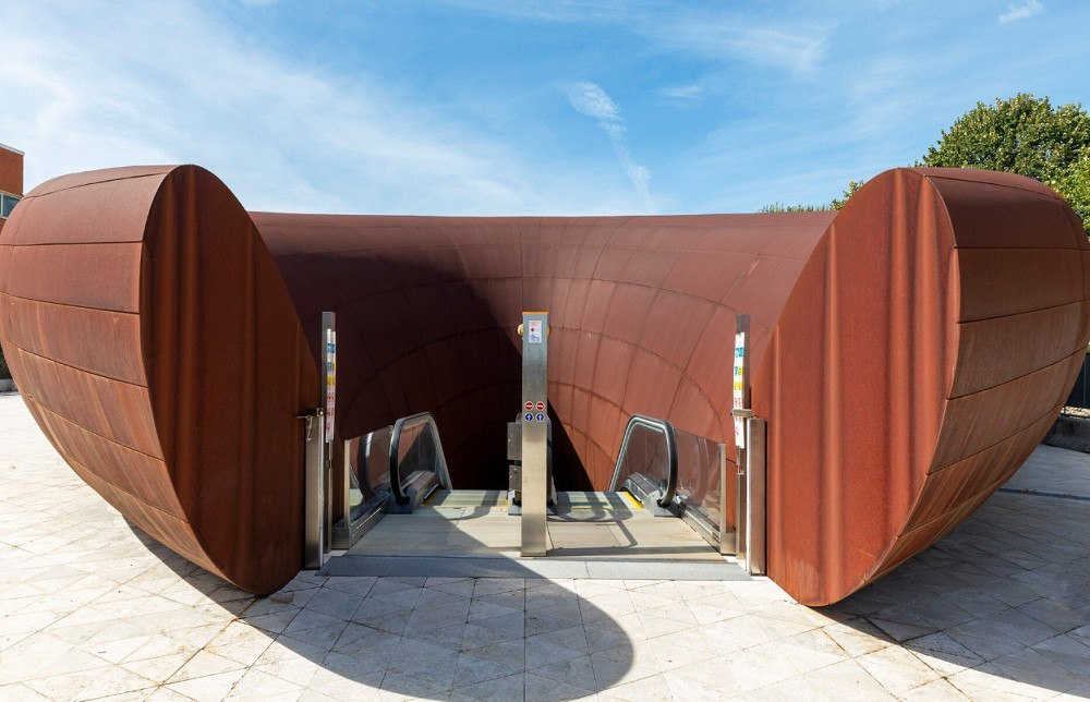Καμπυλωτά πάνελ από ατσάλι περιβάλλουν την είσοδο του σταθμού μετρό Monte Sant'Angelo στη Νάπολη, μια δημιουργία του γλύπτη Ανίς Καπούρ σε συνεργασία με το λονδρέζικο αρχιτεκτονικό στούντιο AL_A.