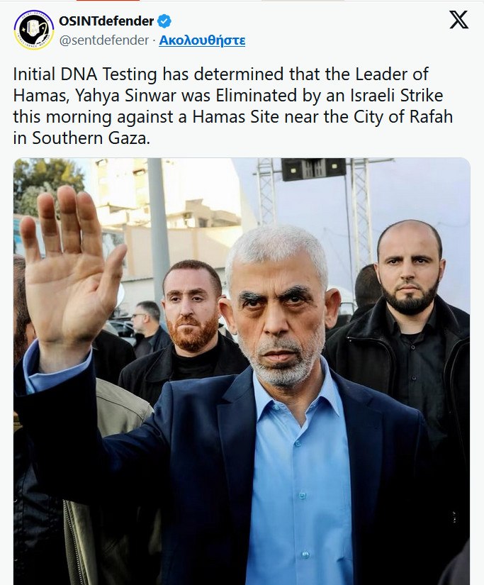 Ο Υπουργός Άμυνας του Ισραήλ, Γιόαβ Γκάλαντ επιβεβαίωσε εμμέσως την εξουδετέρωση του Γιαχία Σινουάρ, με ανάρτηση στον προσωπικό του λογαριασμό στο «Χ».