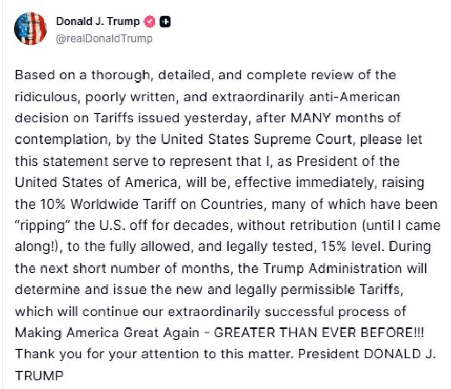 «Με βάση μια διεξοδική, λεπτομερή και πλήρη ανασκόπηση της γελοίας, κακογραμμένης και εξαιρετικά αντιαμερικανικής απόφασης σχετικά με τους δασμούς που εκδόθηκε χθες, μετά από ΠΟΛΛΟΥΣ μήνες σκέψης, από το Ανώτατο Δικαστήριο των Ηνωμένων Πολιτειών, παρακαλώ να θεωρηθεί η παρούσα δήλωση ως δήλωση ότι εγώ, ως Πρόεδρος των Ηνωμένων Πολιτειών της Αμερικής, θα αυξήσω, με άμεση ισχύ, τον παγκόσμιο δασμό 10% σε χώρες, πολλές από τις οποίες «εκμεταλλεύονταν» τις Ηνωμένες Πολιτείες για δεκαετίες, χωρίς αντίποινα (μέχρι που ήρθα εγώ!), στο πλήρως επιτρεπόμενο και νομικά ελεγμένο επίπεδο του 15%. Κατά τη διάρκεια των επόμενων λίγων μηνών, η κυβέρνηση Τραμπ θα καθορίσει και θα εκδώσει τους νέους και νομικά επιτρεπόμενους δασμούς, οι οποίοι θα συνεχίσουν την εξαιρετικά επιτυχημένη διαδικασία μας για να κάνουμε την Αμερική ξανά μεγάλη - ΜΕΓΑΛΥΤΕΡΗ ΑΠΟ ΠΟΤΕ!!! Σας ευχαριστώ για την προσοχή σας σε αυτό το θέμα. Πρόεδρος ΝΤΟΝΑΛΝΤ ΤΡΑΜΠ»