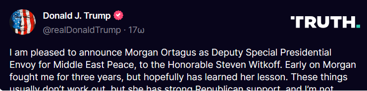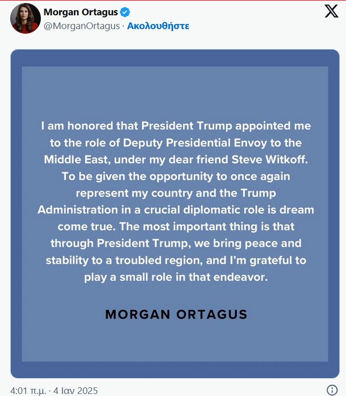 «Είμαι στην ευχάριστη θέση να ανακοινώσω τον Morgan Ortagus ως Αναπληρωτή Ειδικό Απεσταλμένο του Προέδρου για την Ειρήνη στη Μέση Ανατολή, στον αξιότιμο Steven Witkoff. Νωρίς, η Morgan με πολέμησε για τρία χρόνια, αλλά ελπίζω να έχει μάθει το μάθημά της.