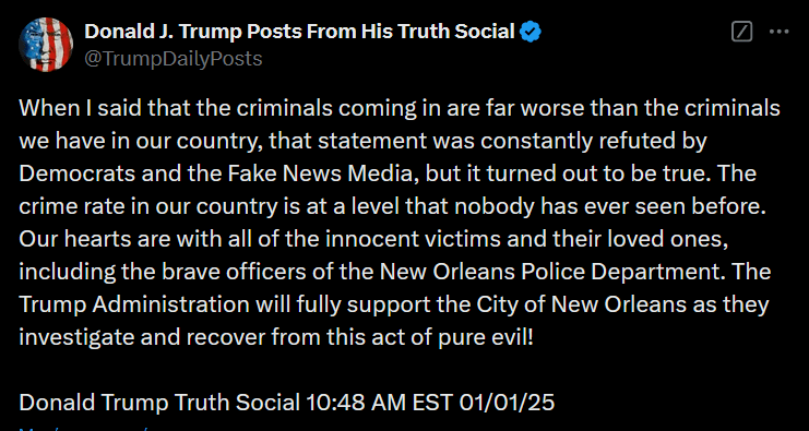 Η κυβέρνηση Τραμπ θα υποστηρίξει πλήρως την πόλη της Νέας Ορλεάνης καθώς ερευνούν και ανακάμπτουν από αυτήν την πράξη καθαρού κακού!», έγραψε στην ανάρτησή του ο Ντόναλντ Τραμπ.