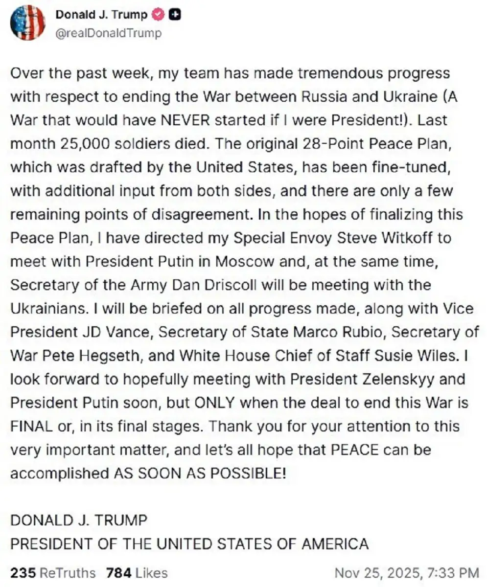 Με την ελπίδα να οριστικοποιηθεί αυτό το Ειρηνευτικό Σχέδιο, έχω δώσει εντολή στον Ειδικό Απεσταλμένο μου, Στιβ Γουίτκοφ, να συναντηθεί με τον Πρόεδρο Πούτιν στη Μόσχα, ενώ ταυτόχρονα ο Υπουργός Στρατού, Νταν Ντρίσκολ, θα συναντηθεί με την ουκρανική πλευρά.