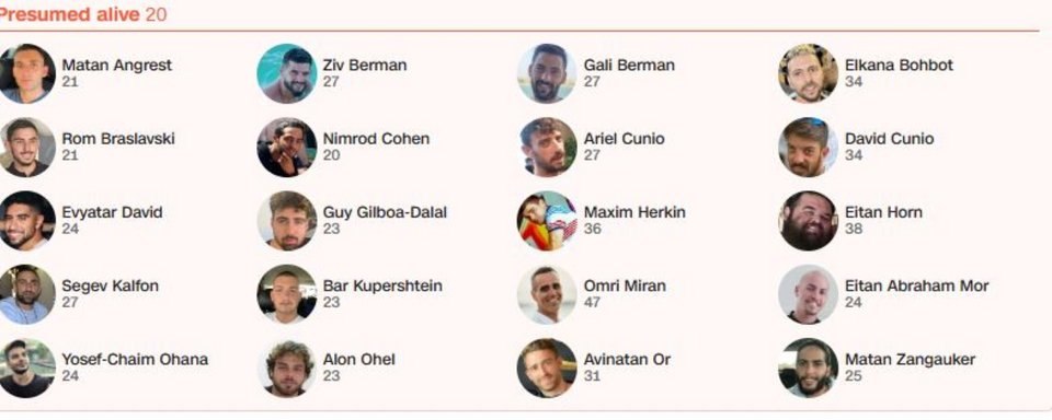 Καθώς έχει ξεκινήσει και επίσημα η αντίστροφη μέτρηση για την επιστροφή των ομήρων που κρατούνται στην Γάζα, αυτοί είναι οι 20 που θεωρούνται ζωντανοί.