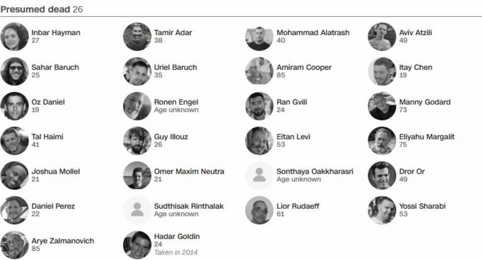 Σε δημοσίευμά του το CNN παραθέτει αναλυτικά για τους 20 που εκτιμάται ότι παραμένουν ζωντανοί, δύο για τους οποίους δεν γνωρίζουμε αν ζουν και 26 που εκτιμάται ότι είναι νεκροί.