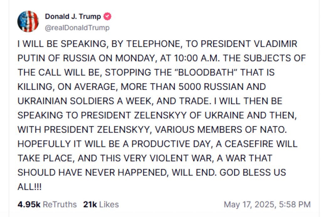 Στην ανάρτησή του στο Truht Social ο πρόεδρος των ΗΠΑ εξέφρασε, σύμφωνα με το protothema.gr, την ελπίδα ότι η σημερινή ημέρα θα είναι «παραγωγική» και θα καταλήξει με ανακοίνωση για εκεχειρία ώστε «αυτός ο πολύ βίαιος πόλεμος, ένας πόλεμος που δεν θα έπρεπε να έχει συμβεί, να σταματήσει».