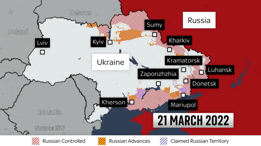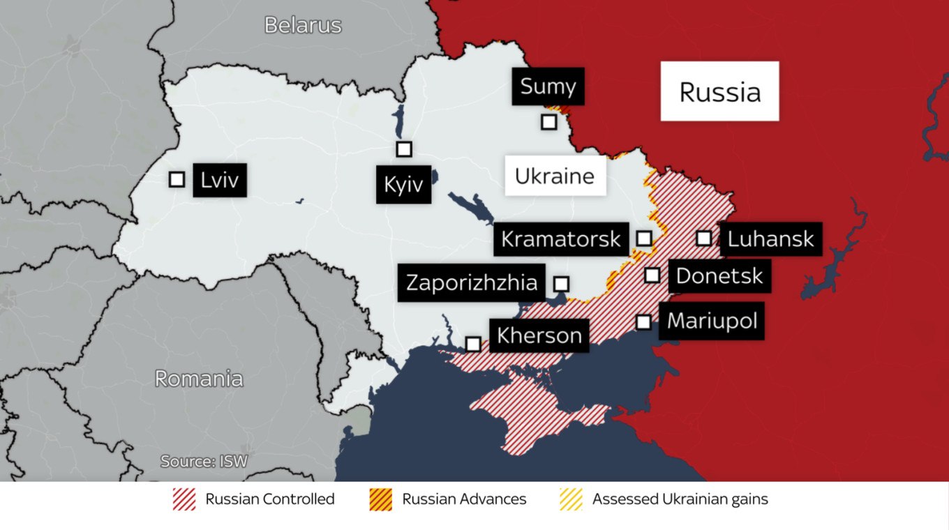 Η Ρωσία κατέχει σήμερα περίπου το 19% της Ουκρανίας, συμπεριλαμβανομένης της Κριμαίας, την οποία προσάρτησε το 2014. Η Μόσχα έχει επικεντρωθεί στις περιοχές Λουχάνσκ, Ντονέτσκ, Ζαπορίζια και Χερσώνα, χωρίς ωστόσο να καταφέρει να τις καταλάβει πλήρως. Στη Λουχάνσκ ελέγχει σχεδόν το σύνολο της περιοχής, αλλά σε Ντονέτσκ, Ζαπορίζια και Χερσώνα περίπου το 30% παραμένει υπό ουκρανικό έλεγχο.