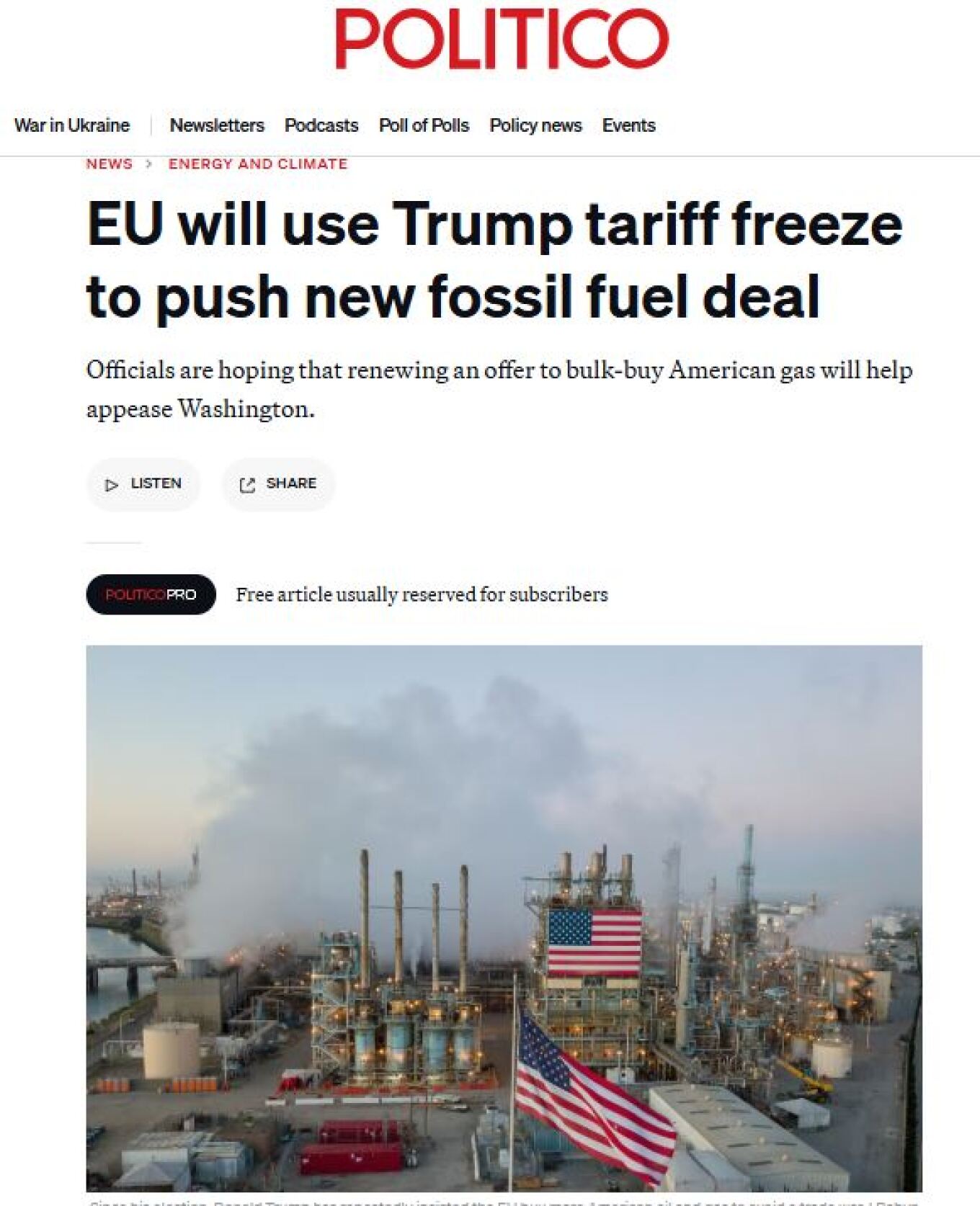 Σχέδιο της Ευρωπαϊκής Ένωσης για να επαναφέρει στο τραπέζι την προσφορά αγοράς περισσότερου φυσικού αερίου «στοιχηματίζοντας ότι ο Ντόναλντ Τραμπ είναι πιο ανοιχτός σε διαπραγματεύσεις μετά την παύση των δασμών που κλονίζουν την οικονομία» περιγράφει σε σημερινό δημοσίευμά του το Politico.